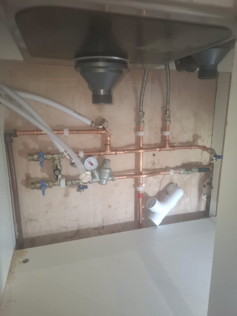 This week we carried out a pipework improvement at a kitchen renovation project in West Hill, Ottery St Mary. Max completed a tidy-up of the existing plumbing under the kitchen sink to improve layout, access and long-term usability.